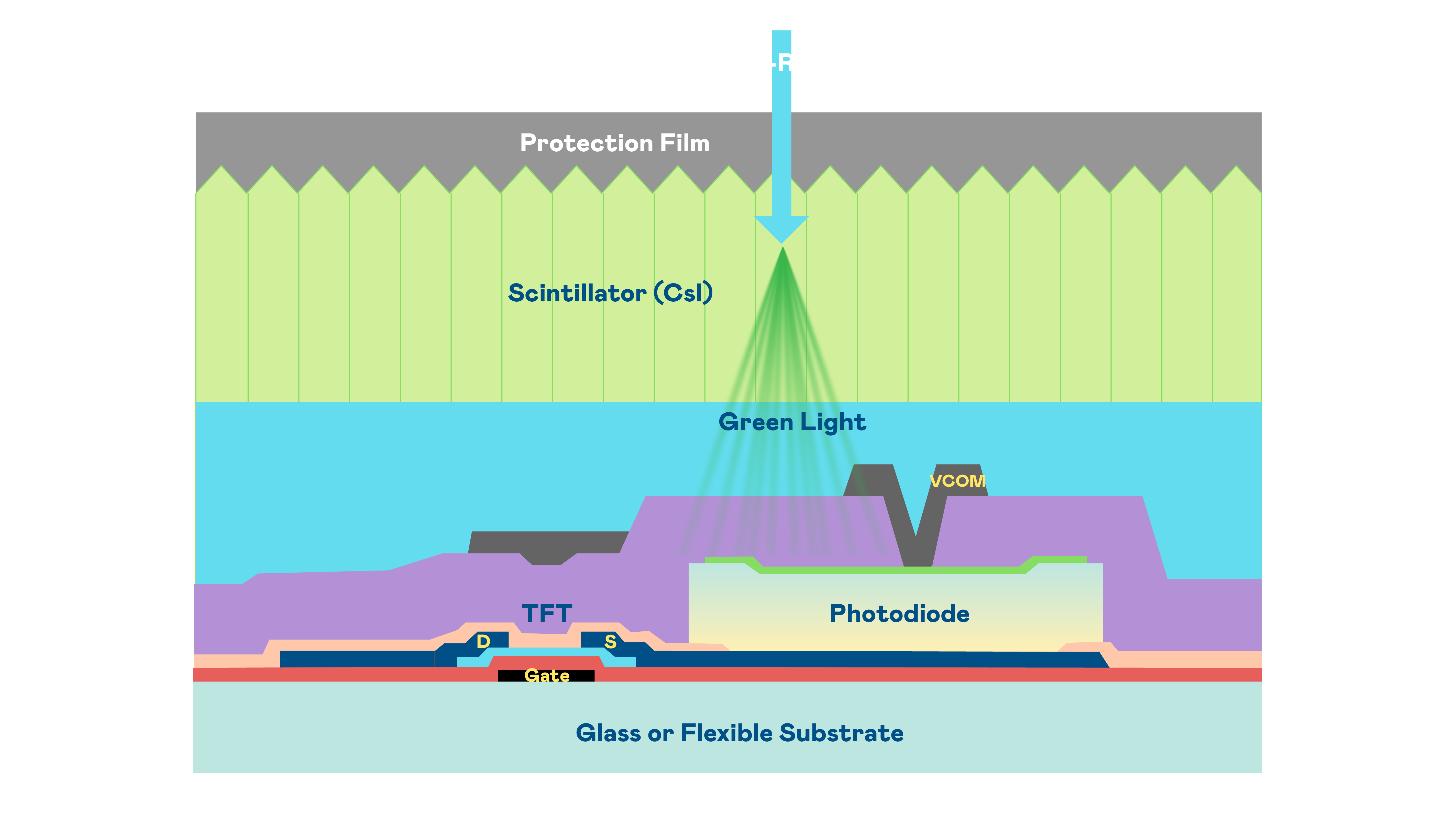 人生就是搏尊龙的X光影像感测阵列使用薄膜电晶体 (TFT) 作为每个像素的读取开关,搭配光电二极体(Photodiode)的光电转换元件,用以感测X光影像讯号。